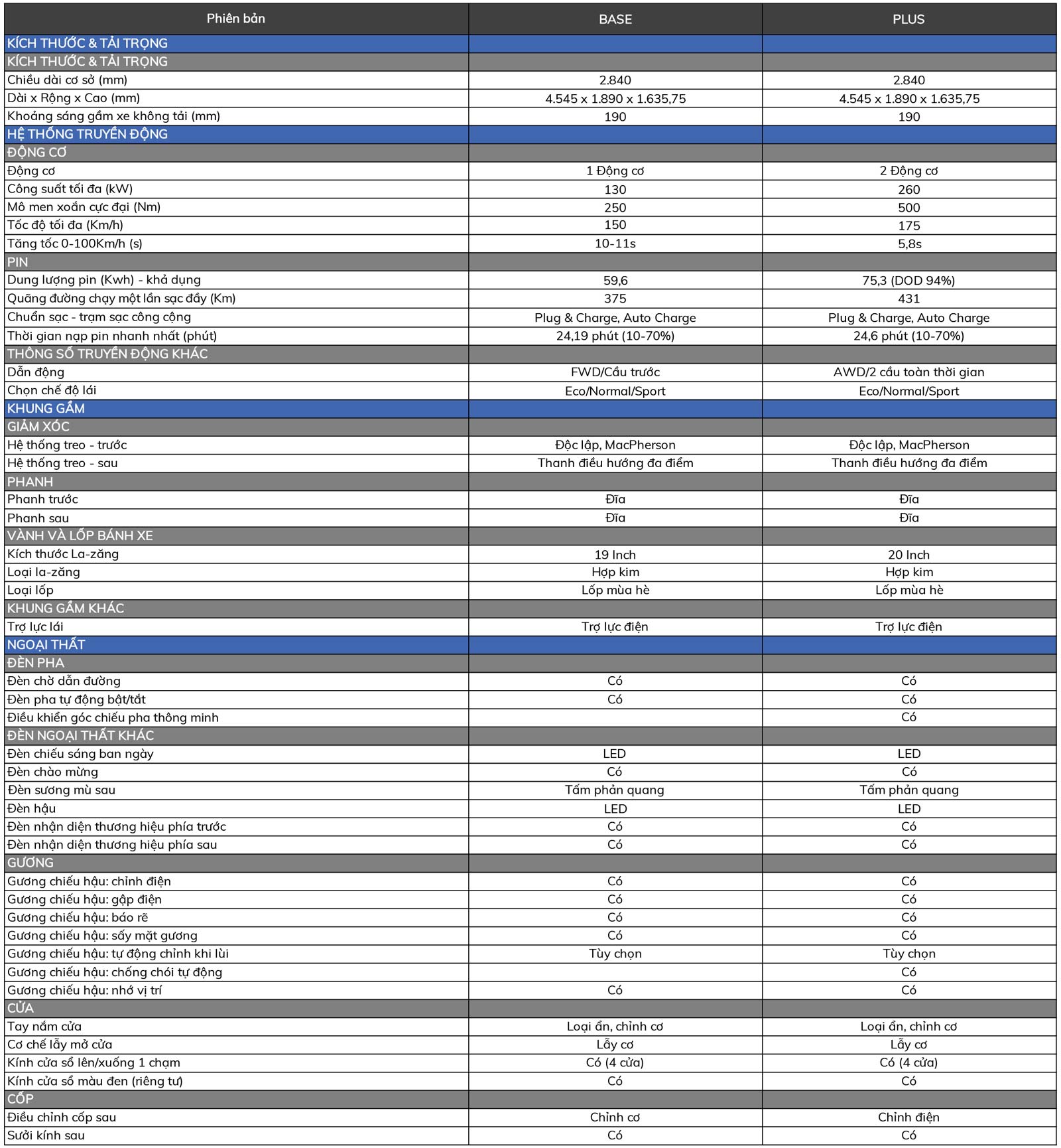 - Quãng đường chạy một lần sạc đầy (Km): 375 (base) | 431 (Plus)